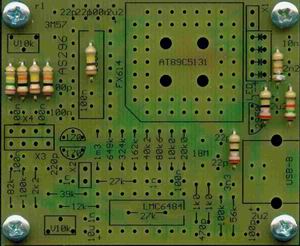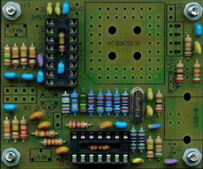 Nun folgenden die restlichen Teile. Bei den Tantal-Elkos ist unbedingt auf die Polung zu achten: der dunkle Strich an der Seite markiert den Pluspol! - auf der Platine ist hier ein Pluszeichen aufgedruckt. Der PLCC-Sockel hat innen einen Pfeil: dieser ist PIN 1. Links davon befindet sich die abgeschrägte Ecke!