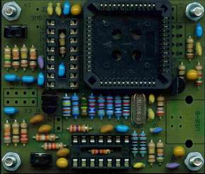 Nun folgenden die restlichen Teile. Bei den Tantal-Elkos ist unbedingt auf die Polung zu achten: der dunkle Strich an der Seite markiert den Pluspol! - auf der Platine ist hier ein Pluszeichen aufgedruckt. Der PLCC-Sockel hat innen einen Pfeil: dieser ist PIN 1. Links davon befindet sich die abgeschrägte Ecke!